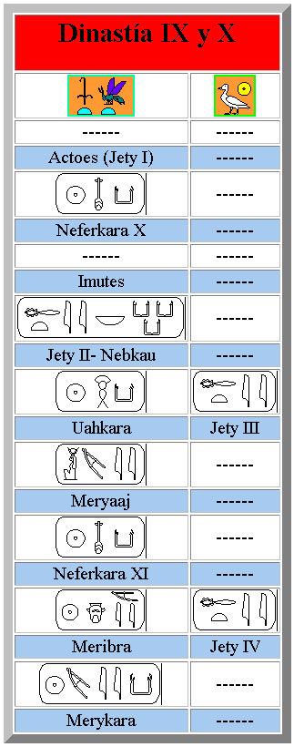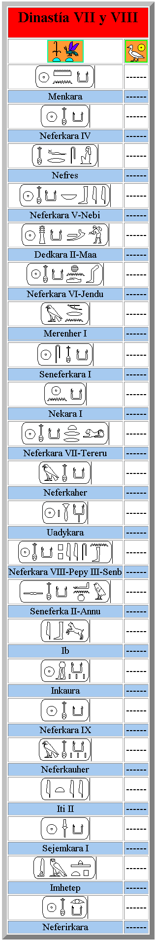Los faraones de la VIII dinastía nos son solamente conocidos por dos textos, uno sobre papiro (el papiro de Turín) y el otro sobre piedra (la Tabla de Abido) y que muestran la cronología real de la historia de Egipto desde la época mítica de gobierno divino hasta el reinado de Ramses II.