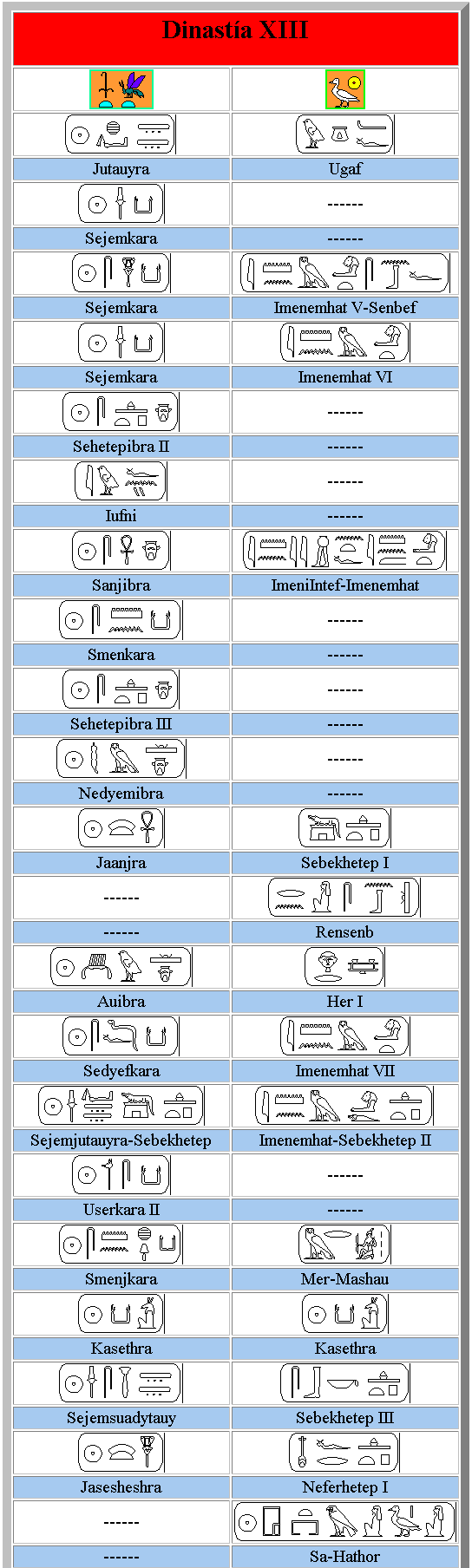 La dinastía XIII es muy poco conocida. La razón se debe en gran parte a que sus reyes fueron muy numerosos (unos 60) y el reinado total muy corto (unos 150 años), esto da a cada rey un reinado de poco más de dos años. Es tan poco conocida que ni siquiera se conoce el orden cronológico real, aunque la mayoría de los egiptólogos establece como fundador al faraón Ugaf.