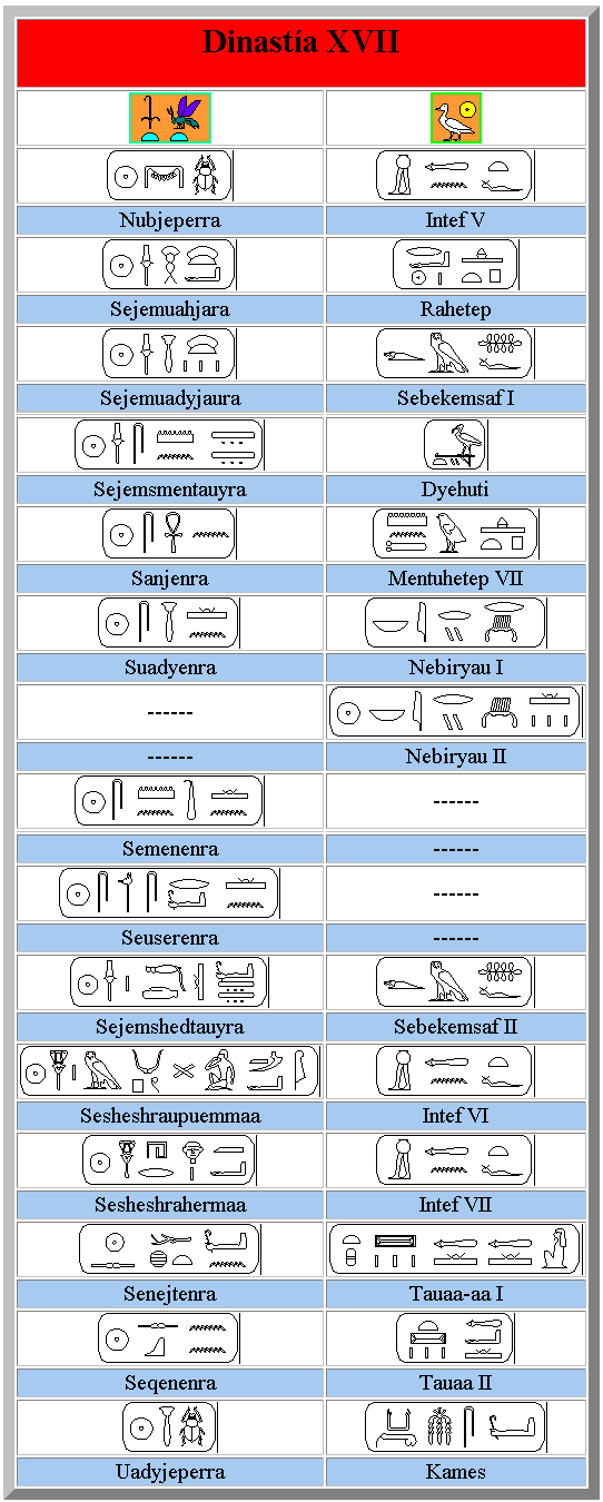 El fundador de esta dinastía fue Intef a quien le sucedióRahetep. Posteriormente, durante el reinado de Taa II se produce el comienzo de la guerra entre Tebas y los Hicsos cuyo rey era Apofis I. Taa II murió en batalla sucediéndole su hijo Kamose que se puso al frente del ejercito en la lucha contra Apofis. Con ayuda de mercenarios hizo retroceder a Apofis desde Cusas (al norte de Asiut, muy cerca de la futura Akhetaton) hasta el oasis del Fayum. Su reinado fue corto, ya que en el año 3 falleció prematuramente. Le sucedió su joven hermano Amosis quien definitivamente expulsó a los Hicsos de Egipto. Primero luchó contra Apofis II y luego contra Jamudy. Tomó y saqueo Avaris y no contento con ello les expulsó definitivamente de Egipto persiguiéndoles hasta Palestina donde combatió durante tres años.